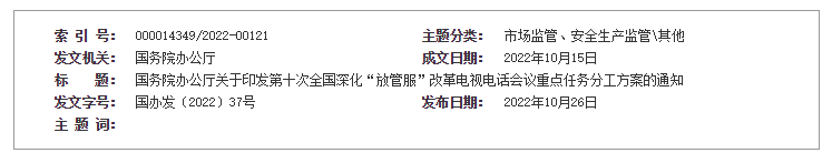國務院辦公廳關于印發第十次 全國深化“放管服”改革電視電話會議 重點任務分工方案的通知 國辦發〔2022〕37號 各省、自治區、直轄市人民政府,國務院各部委、各直屬機構: 《第十次全國深化“放管服”改革電視電話會議重點任務分工方案》已經國務院同意,現印發給你們,請結合實際認真貫徹落實。 國務院辦公廳 2022年10月15日 (此件公開發布) 第十次全國深化“放管服”改革 電視電話會議重點任務分工方案 黨中央、國務院高度重視深化“放管服”改革優化營商環境工作。2022年8月29日,李克強總理在第十次全國深化“放管服”改革電視電話會議上發表重要講話,部署持續深化“放管服”改革,推進政府職能深刻轉變,加快打造市場化法治化國際化營商環境,著力培育壯大市場主體,穩住宏觀經濟大盤,推動經濟運行保持在合理區間。為確保會議確定的重點任務落到實處,現制定如下分工方案。 一、依靠改革開放釋放經濟增長潛力 (一)繼續把培育壯大市場主體作為深化“放管服”改革的重要著力點,堅持“兩個毫不動搖”,對各類所有制企業一視同仁,依法平等保護各類市場主體產權和合法權益、給予同等政策支持。(市場監管總局、國家發展改革委、工業和信息化部、司法部、財政部、商務部、國務院國資委、國家知識產權局等國務院相關部門及各地區按職責分工負責) 具體舉措: 1.落實好《促進個體工商戶發展條例》,抓緊制定完善配套措施,切實解決個體工商戶在經營場所、用工、融資、社保等方面面臨的突出困難和問題,維護個體工商戶合法權益,穩定個體工商戶發展預期。(市場監管總局牽頭,國務院相關部門及各地區按職責分工負責) 2.深入開展制止濫用行政權力排除、限制競爭執法專項行動,進一步健全公平競爭審查制度,建立健全市場競爭狀況監測評估和預警機制,更大力度破除地方保護、市場分割,切實維護公平競爭市場秩序。(市場監管總局牽頭,國務院相關部門及各地區按職責分工負責) 3.持續清理招投標領域針對不同所有制企業、外地企業設置的各類隱性門檻和不合理限制,暢通招標投標異議、投訴渠道,嚴厲打擊圍標串標、排斥潛在投標人等違法違規行為。(國家發展改革委牽頭,國務院相關部門及各地區按職責分工負責) (二)加快推進納入國家“十四五”規劃以及省級規劃的重點項目,運用“放管服”改革的辦法,打通堵點卡點,繼續采取集中辦公、并聯辦理等方式,提高審批效率,強化要素保障,推動項目盡快落地。同時,進一步壓實地方政府和相關業主單位的責任,加強監督。(國家發展改革委牽頭,自然資源部、生態環境部、住房城鄉建設部、交通運輸部、水利部、審計署等國務院相關部門及各地區按職責分工負責) 具體舉措: 1.依托推進有效投資重要項目協調機制,加強部門協同,高效保障重要項目盡快落地,更好發揮有效投資對經濟恢復發展的關鍵性作用。(國家發展改革委牽頭,國務院相關部門及各地區按職責分工負責) 2.落實好重要項目用地、規劃、環評、施工許可、水土保持等方面審批改革舉措,對正在辦理手續的項目用海用島審批實行即接即辦,優化水利工程項目招標投標程序,推動項目及時開工,盡快形成實物工作量。(自然資源部、生態環境部、住房城鄉建設部、水利部等國務院相關部門及各地區按職責分工負責) (三)依法盤活用好5000多億元專項債地方結存限額,與政策性開發性金融工具相結合,支持重點項目建設。在專項債資金和政策性開發性金融工具使用過程中,注重創新機制,發揮對社會資本的撬動作用。引導商業銀行擴大中長期貸款投放,為重點項目建設配足融資。(財政部、國家發展改革委、人民銀行、銀保監會等國務院相關部門及各地區按職責分工負責) 具體舉措: 指導政策性開發性銀行用好用足政策性開發性金融工具額度和8000億元新增信貸額度,優先支持專項債券項目建設。鼓勵商業銀行信貸資金等通過銀團貸款、政府和社會資本合作(PPP)等方式,按照市場化原則加大對重要項目建設的中長期資金支持力度。(財政部、人民銀行、銀保監會等國務院相關部門及各地區按職責分工負責) (四)抓緊研究支持制造業企業、職業院校等設備更新改造的政策,金融機構對此要增加中長期貸款投放。完善對銀行的考核辦法,銀行要完善內部考評和盡職免責規定,形成激勵機制。持續釋放貸款市場報價利率改革和傳導效應,降低企業融資和個人消費信貸成本。(人民銀行、銀保監會、國家發展改革委、財政部、教育部、工業和信息化部、人力資源社會保障部等國務院相關部門及各地區按職責分工負責) 具體舉措: 繼續深化利率市場化改革,發揮存款利率市場化調整機制作用,釋放貸款市場報價利率(LPR)形成機制改革效能,促進降低企業融資和個人消費信貸成本。督促21家全國性銀行完善內部考核、盡職免責和激勵機制,引導商業銀行擴大中長期貸款投放,為設備更新改造等配足融資。(人民銀行、銀保監會負責) (五)落實好階段性減征部分乘用車購置稅、延續免征新能源汽車購置稅、放寬二手車遷入限制等政策。給予地方更多自主權,因城施策運用好政策工具箱中的40多項工具,靈活運用階段性信貸政策,支持剛性和改善性住房需求。有關部門和各地區要認真做好保交樓、防爛尾、穩預期相關工作,用好保交樓專項借款,
